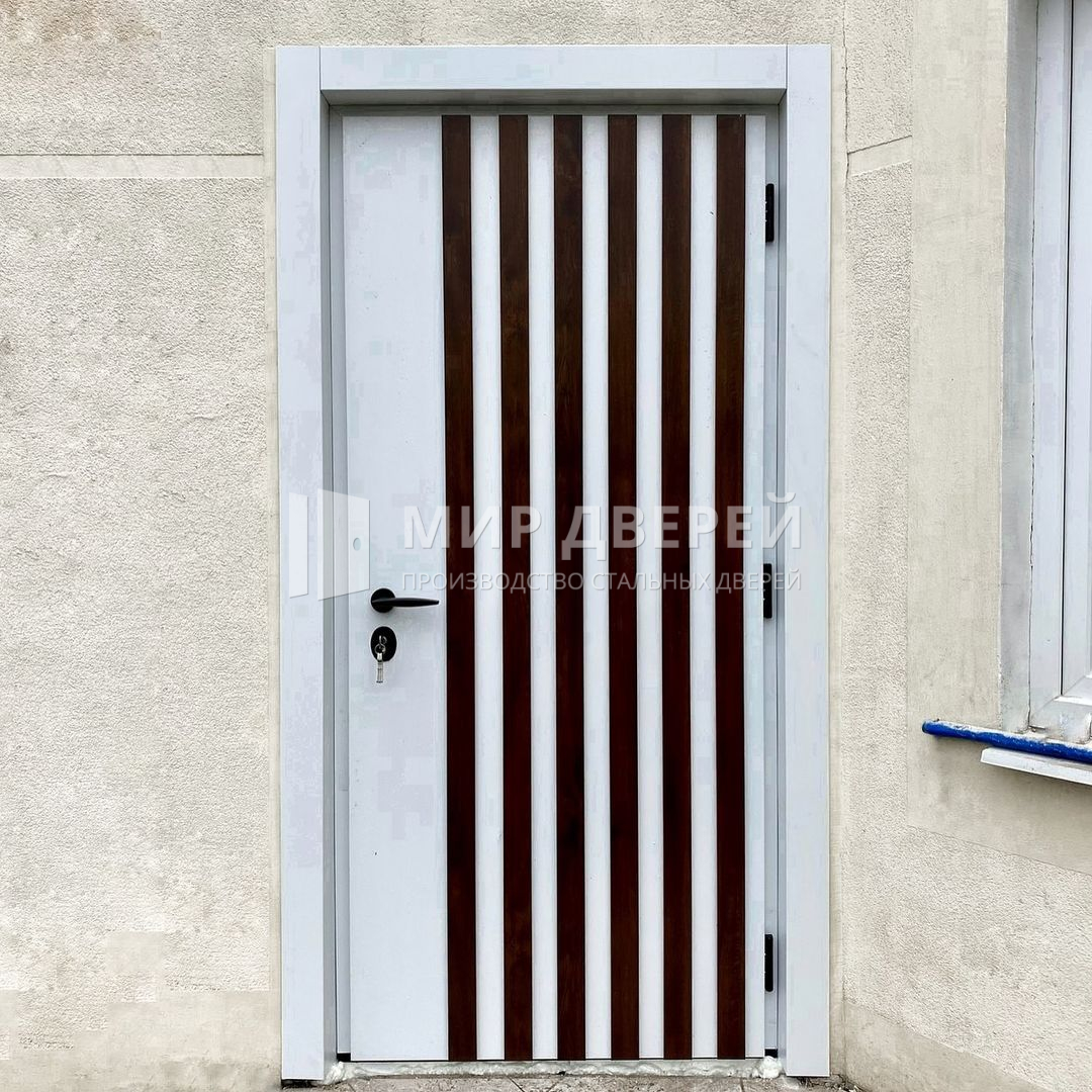Металлическая дверь с МДФ накладкой №49 предназначена для установки в коттеджах, частных домах и офисных помещениях, где важны как безопасность, так и эстетика. Эта модель сочетает в себе элегантность и прочность: внешнее и внутреннее покрытие из МДФ ПВХ в коричневом цвете придает двери респектабельный вид.